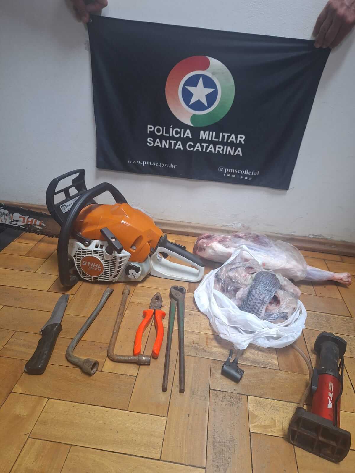 Durante a abordagem, o suspeito admitiu ter pegado um alicate, uma chave tipo cachimbo e uma chave de rodas, afirmando que a motosserra havia permanecido no local.