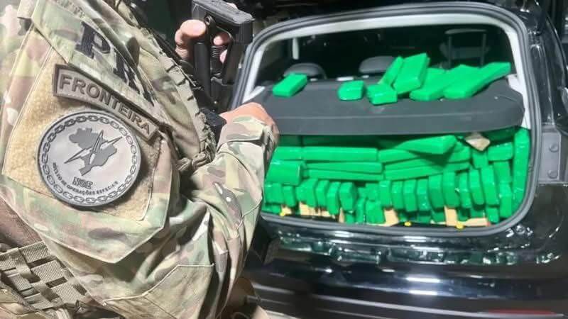 Além do entorpecente, foi constatado que o veículo possuía registro de furto/roubo e circulava com placas falsas.