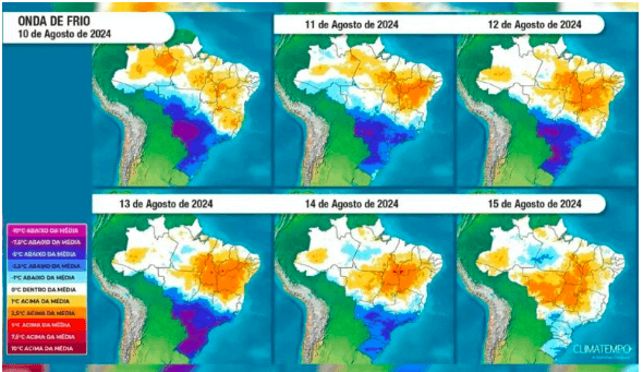 Além de Santa Catarina, as regiões mais afetadas pelo frio intenso serão: Mato Grosso do Sul, oeste de São Paulo, Paraná e Rio Grande do Sul. Nesses Estados, as temperaturas poderão ficar até 5°C abaixo da média para o mês de agosto.