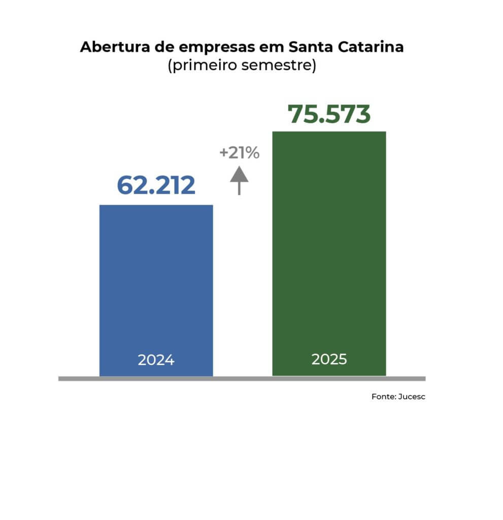 Santa Catarina vive um momento positivo para quem deseja empreender. No primeiro semestre de 2025, o estado registrou a abertura de 75,5 mil novas empresas — um crescimento de 21,4% em relação ao mesmo período do ano passado. O dado é da Junta Comercial do Estado de Santa Catarina (Jucesc) e representa o saldo entre constituições e extinções de empresas.
