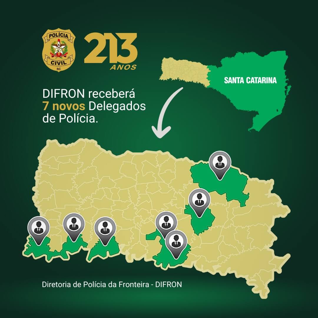 A Diretoria de Polícia da Fronteira (DIFRON) da Polícia Civil de Santa Catarina será reforçada com a chegada de sete novos Delegados de Polícia nos próximos dias. A informação foi confirmada pelo Delegado-Geral da PCSC, Dr. Ulisses Gabriel.