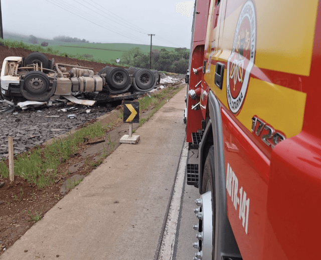 Na manhã deste domingo (24), um caminhão saiu da pista e capotou na BR-163, em Guarujá do Sul. O acidente ocorreu por volta das 7h10, mobilizando o Corpo de Bombeiros Militar de São José do Cedro.