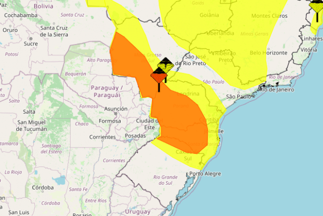 O Inmet (Instituto Nacional de Meteorologia) também emitiu um alerta para chuvas intensas no estado catarinense neste domingo. De acordo com o órgão, podem ser registradas chuvas de 30 a 60 mm/h, podendo chegar a um acumulado de 100 mm no dia.