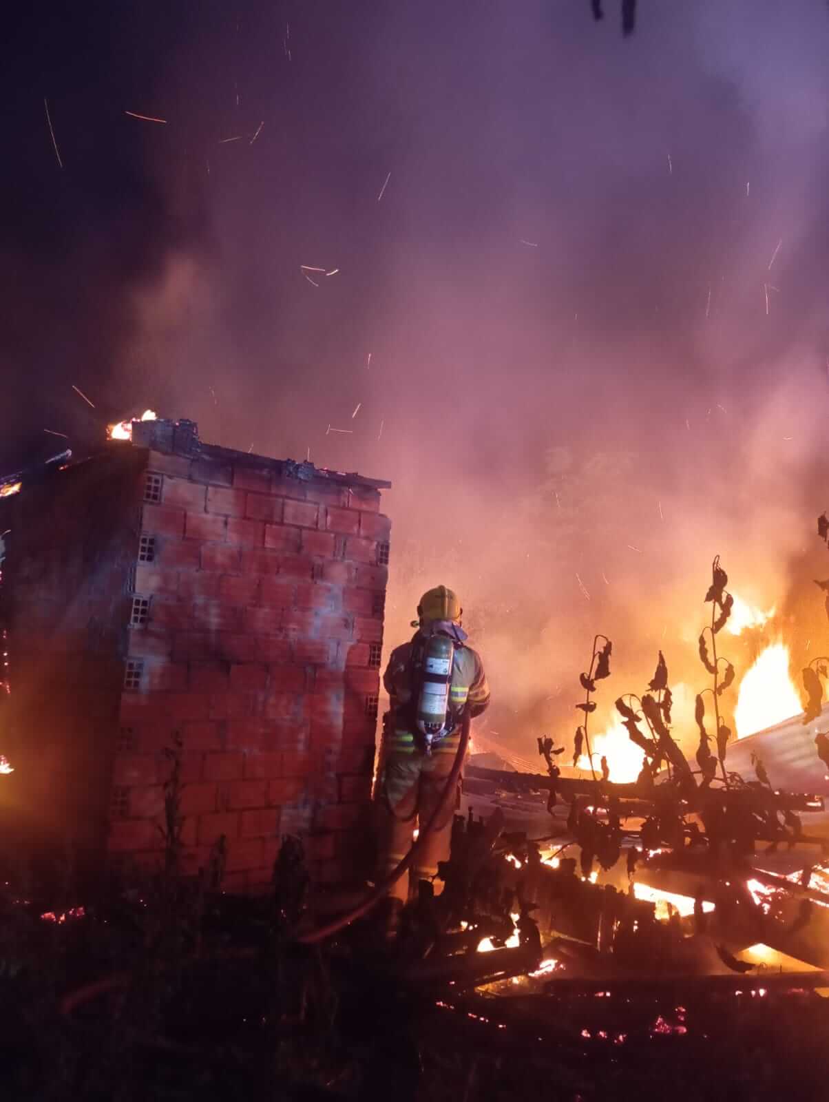 O Corpo de Bombeiros foi acionado por volta das 21h28min e constatou que a casa, uma residência unifamiliar de madeira com aproximadamente 25 metros quadrados, estava completamente tomada pelas chamas, com colapso total de paredes e teto. Após o corte da energia elétrica e a avaliação de riscos, os bombeiros iniciaram o combate direto ao fogo, realizando também o rescaldo para evitar a reignição. Nenhum bem pôde ser salvo, e a residência ficou totalmente destruída.
