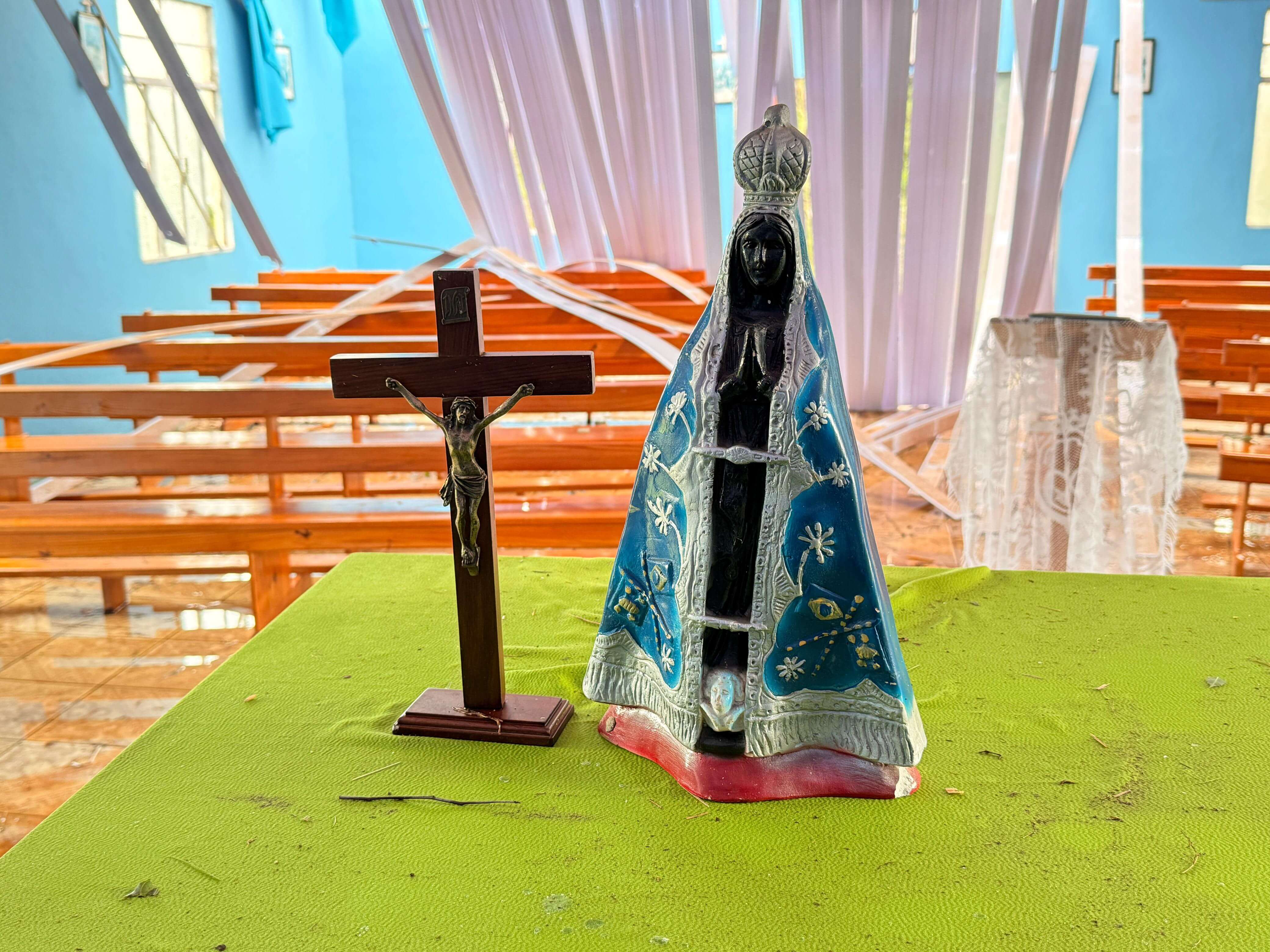 O que mais impressionou os moradores foi o fato de o espaço onde estavam as imagens dos santos e a Bíblia ter permanecido intacto, mesmo com o restante do telhado completamente arrancado pela força dos ventos. Ao redor da igreja, a destruição era evidente: árvores arrancadas pela raiz, casas destelhadas e galhos espalhados por toda a comunidade.