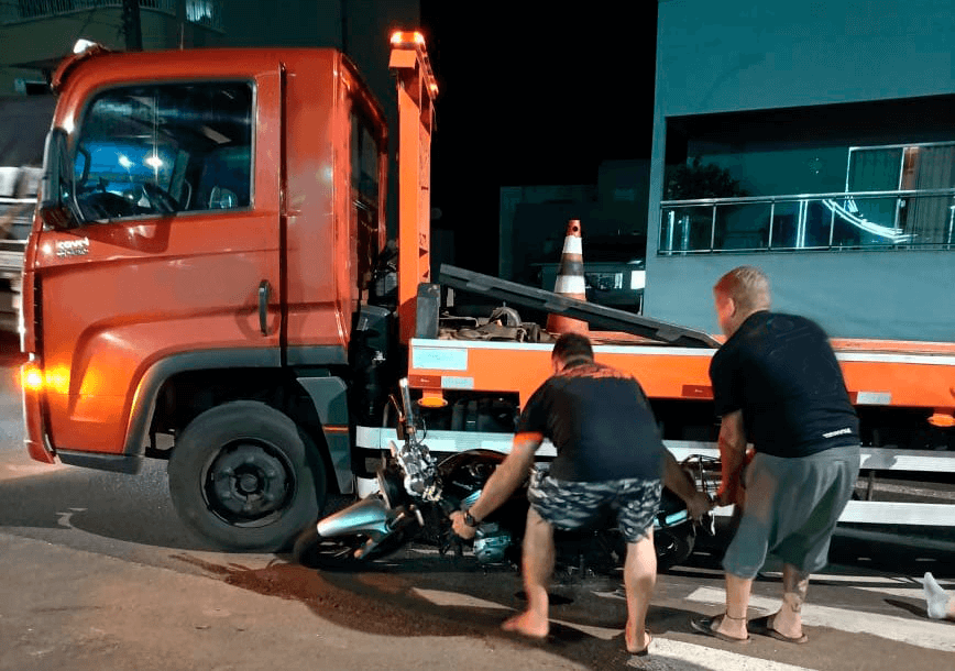 Colisão entre motocicleta e caminhão guincho deixa entregador ferido no centro de Barracão