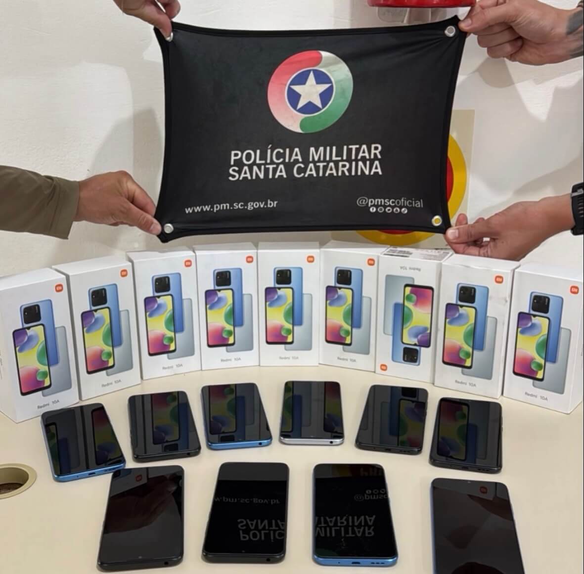 A Polícia Militar foi acionada e realizou a abordagem, detendo os três homens, dois irmãos e um amigo. Durante a verificação, os policiais encontraram os dez celulares em bom estado de conservação, além de nove caixas dos aparelhos.