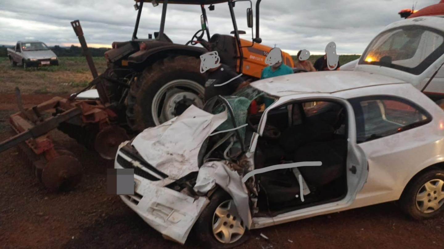 A colisão envolveu um veículo GM Celta branco e um trator