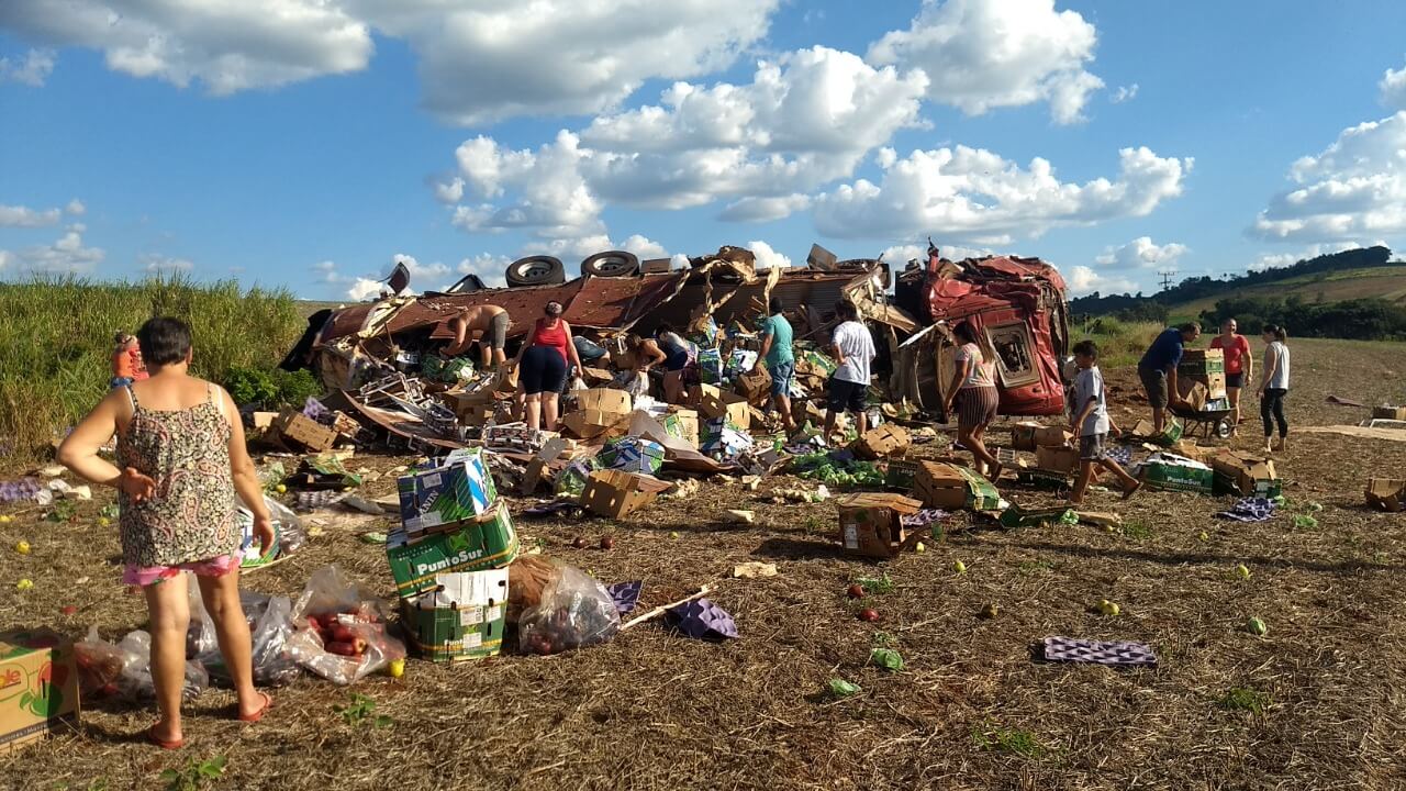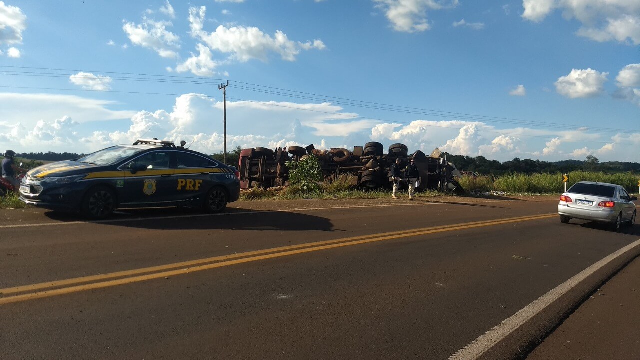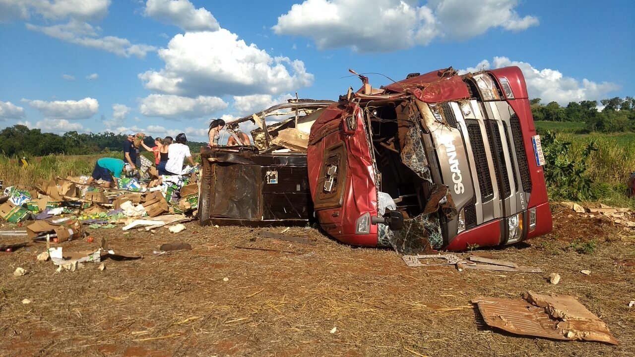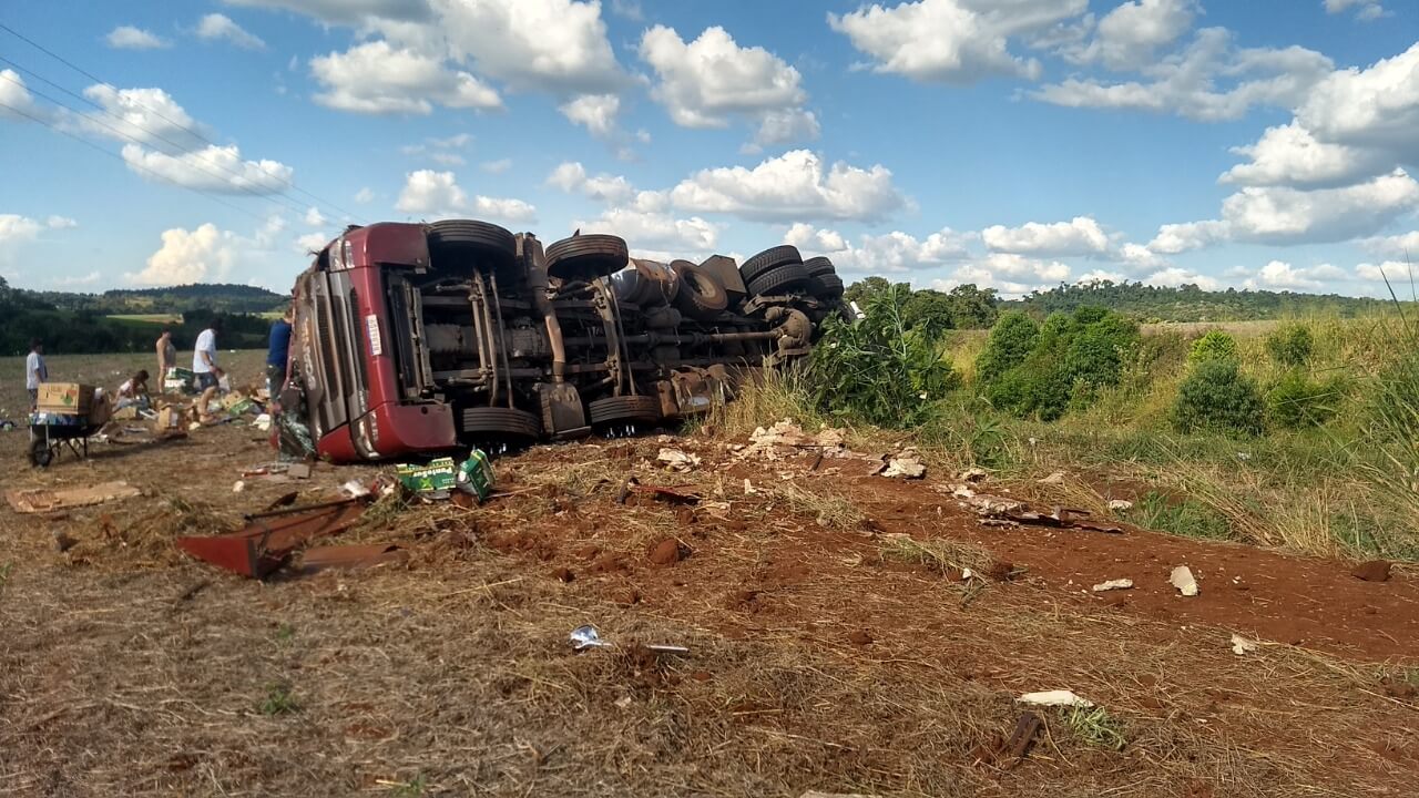 O acidente aconteceu na comunidade de São Pedro, BR-163, interior de Capanema/PR e envolveu um caminhão Scania/P320, placas Mercosul, que estava carregado com frutas.