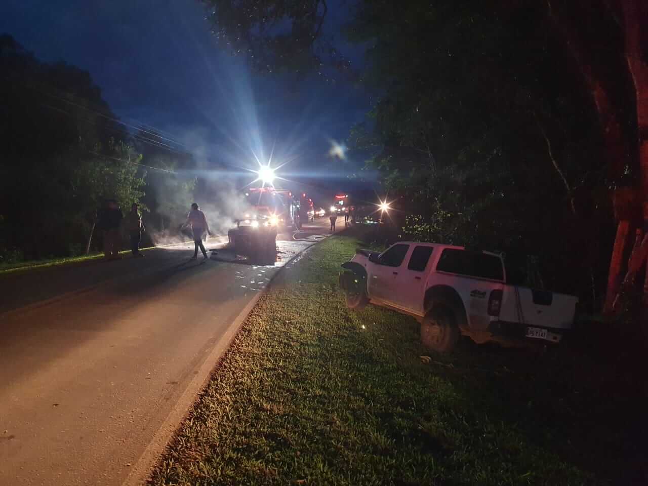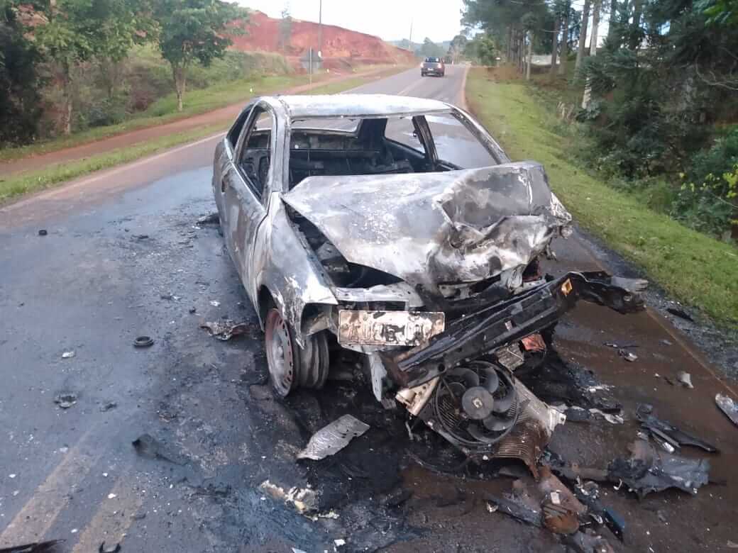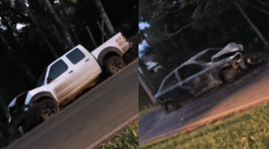 A colisão foi entre uma Nissan Frontier e um Astra. O veículo Astra, com o impacto acabou incendiando e ainda está sobre a pista.