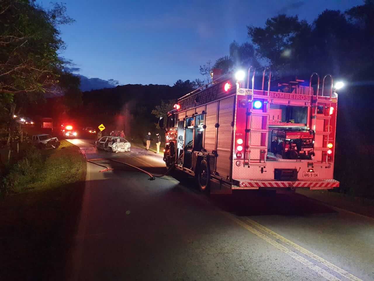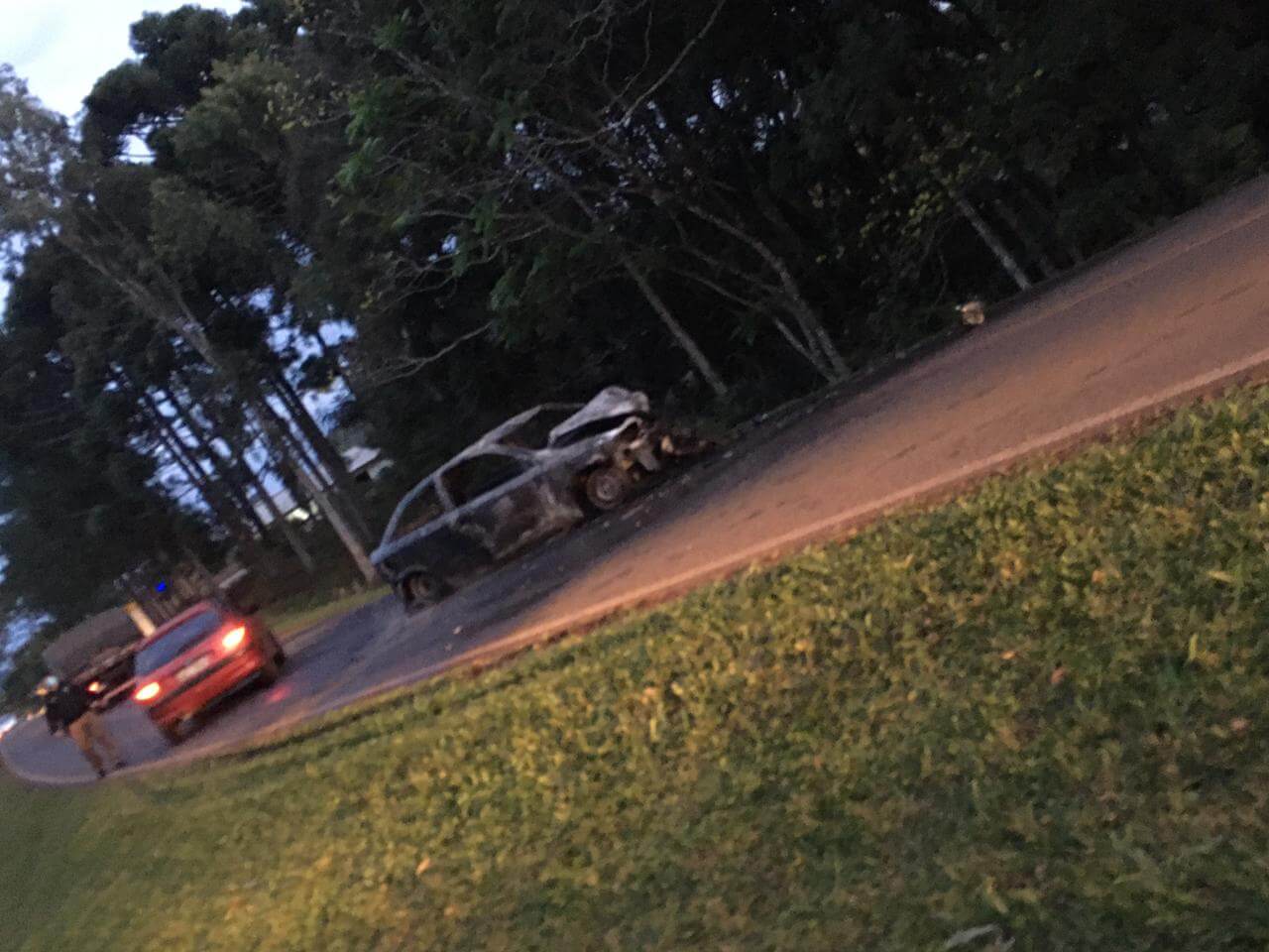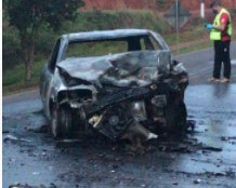 O Condutor do veículo carbonizado, um masculino de 30 anos, encontrava-se em decúbito dorsal (deitado), consciente, orientado, queixando-se de dores no tórax e suspeita de fratura em Membro Inferior Esquerdo. Também foi atendido o carona do veículo, um masculino de 19 anos que também estava em decúbito dorsal, consciente, orientado, relatando dores e apresentava ferimento corto contuso na face e suspeita de fratura na região dos arcos costais.