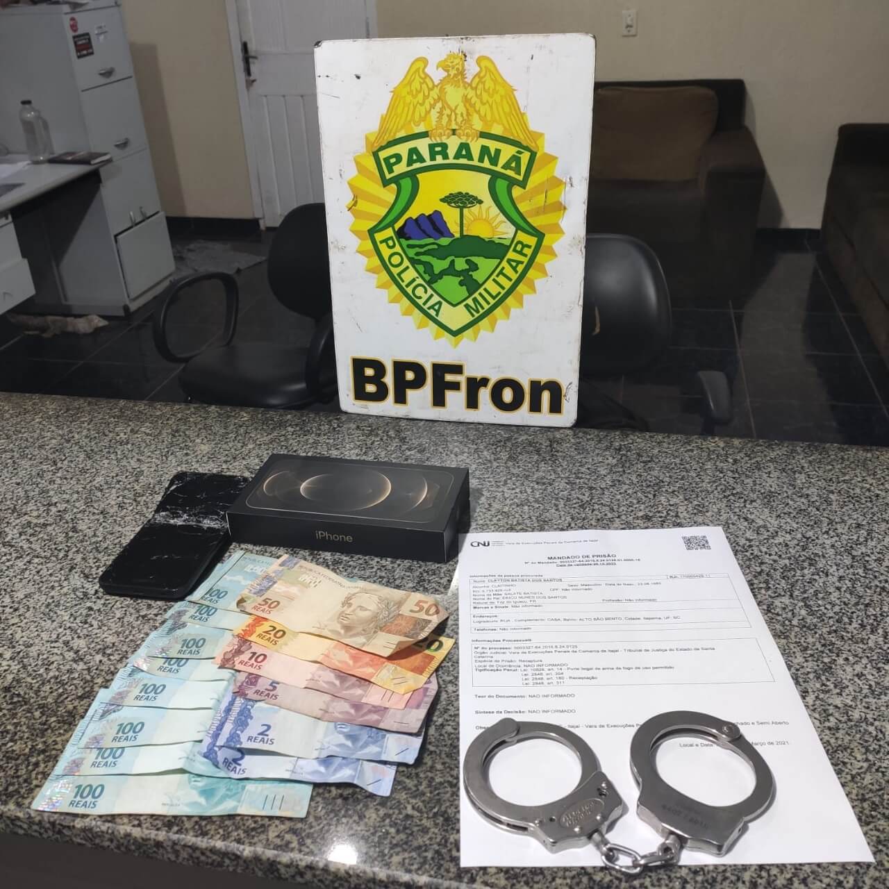 Ao ser abordado o masculino maior de idade, relatou que o celular é objeto de furto/roubo e após consulta no sistema policial foi constatado um mandado de prisão em seu desfavor pelo crime de receptação e porte ilegal de arma de fogo espedido pelo estado de Santa Catarina, também foi localizado em sua bagagem um celular iPhone 12 sem documentação pertinente.