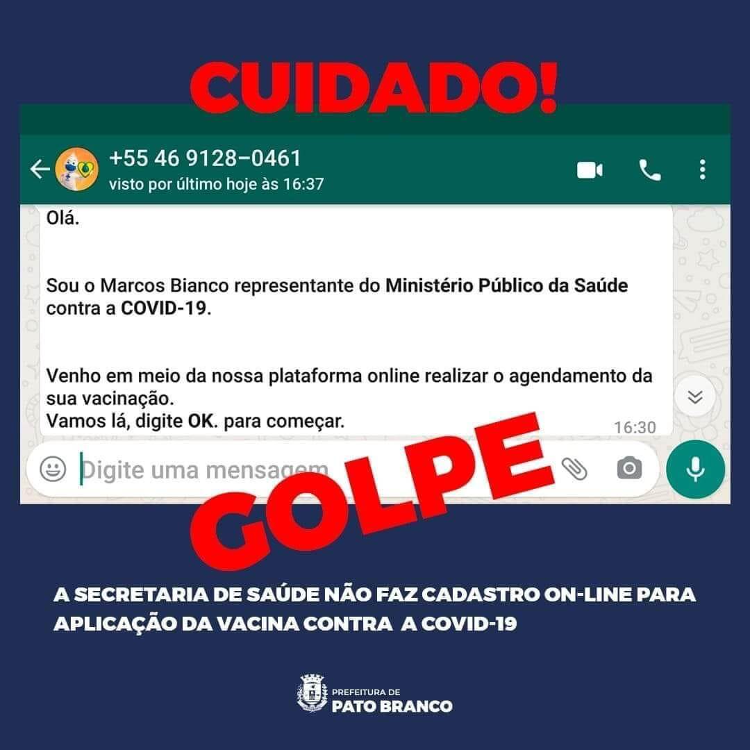 Está circulando uma mensagem em que um número se apresenta como representante do Ministério Público da Saúde e indica que irá realizar o agendamento da vacina. Não existe dentro das esferas o Ministério Público da Saúde, além de que as vacinas em Pato Branco estão sendo aplicadas nas unidades de saúde dos bairros, na sala de vacina central e pelo drive-thru, sem agendamento.