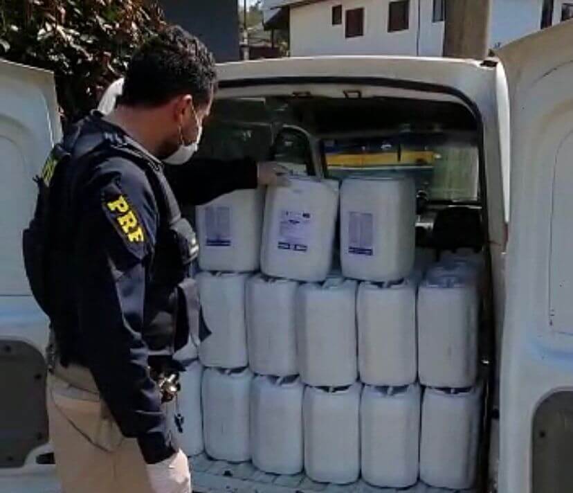 Durante abordagem a um Renault Kangoo, com placas de Delta (MG), os policiais encontraram no compartimento de carga 60 embalagens de agrotóxicos com dez litros cada. No entanto, os rótulos tinham fortes indícios de serem falsos.
