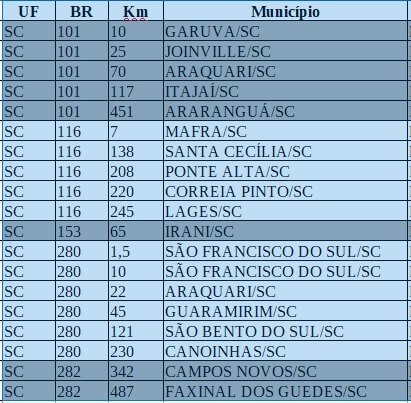A Polícia Rodoviária Federal (PRF) divulgou por volta das 8h30 da manhã desta quarta-feira, dia 8, que há manifestações em pelo menos 19 trechos de rodovias federais em Santa Catarina (veja a tabela abaixo).