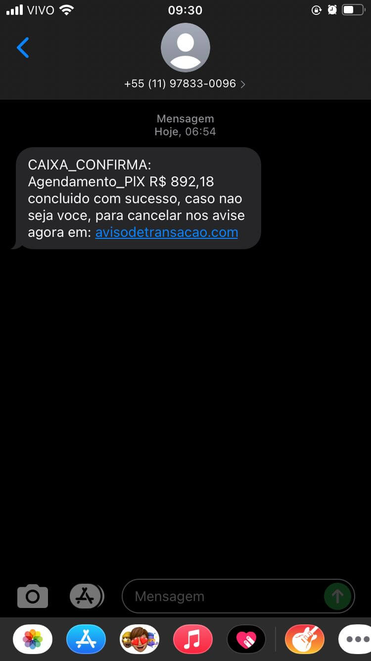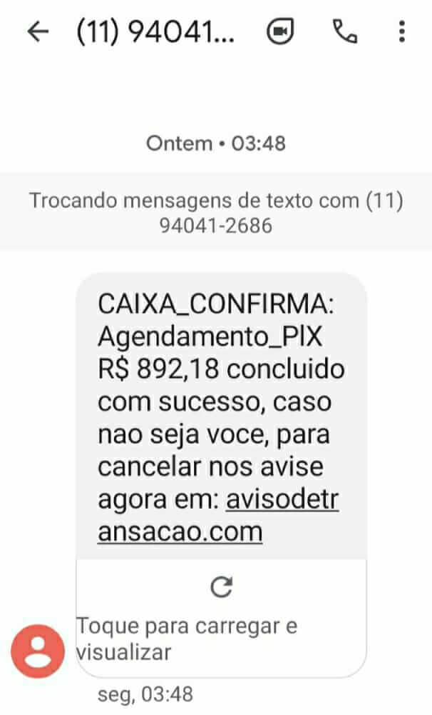 - “CAIXA_CONFIRMA: Agendamento_PIX R$ 892,18 concluído com sucesso, caso não seja você, para cancelar nos avisa agora em: (nesse ponto é inserido o link suspeito)