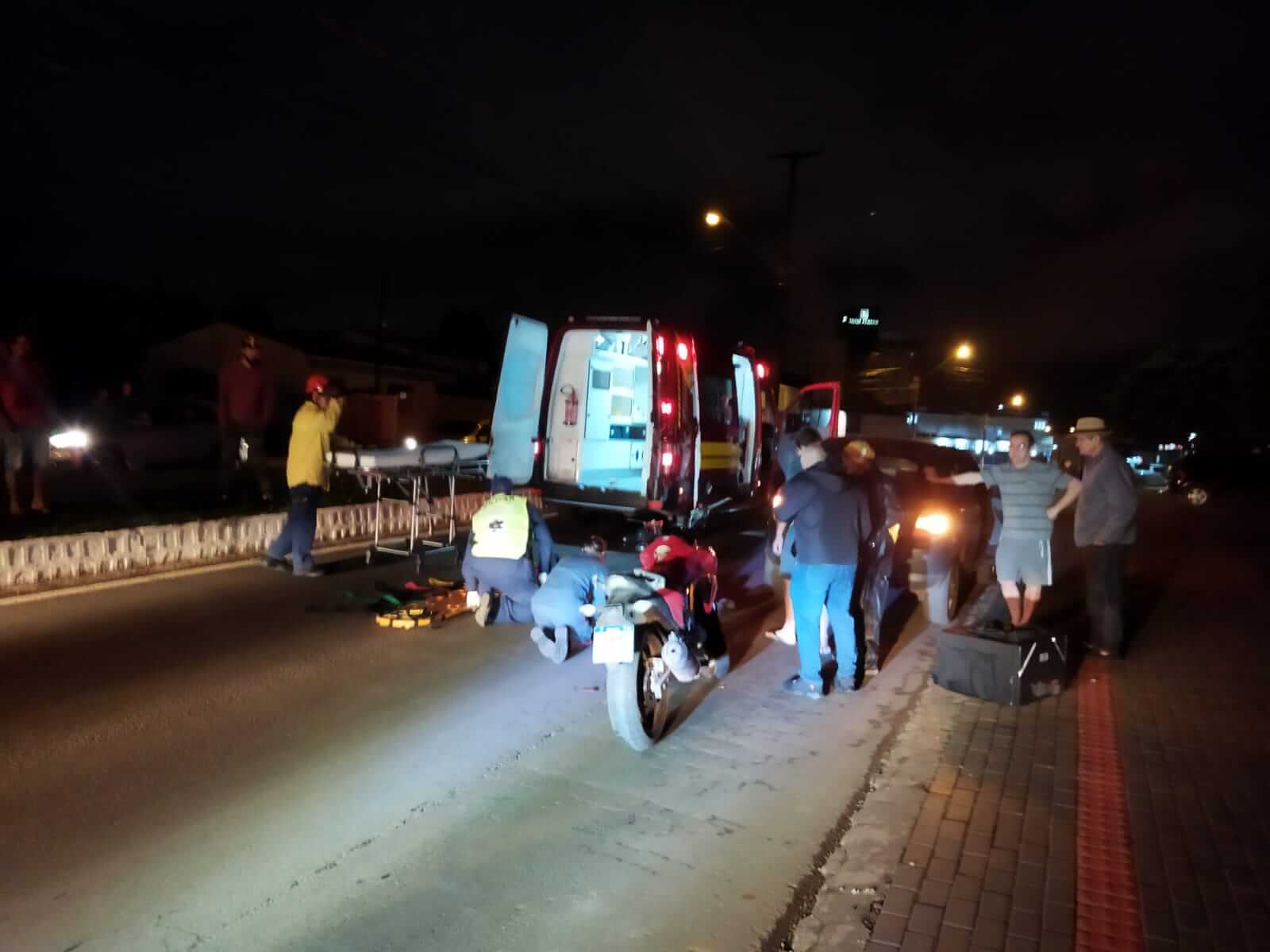 O trânsito ficou interrompido de um lado da via durante o atendimento. Moto e carro tiveram danos de pequena monta.