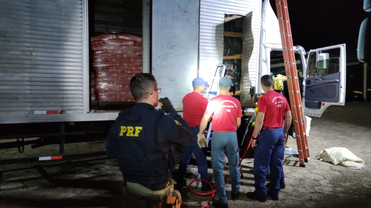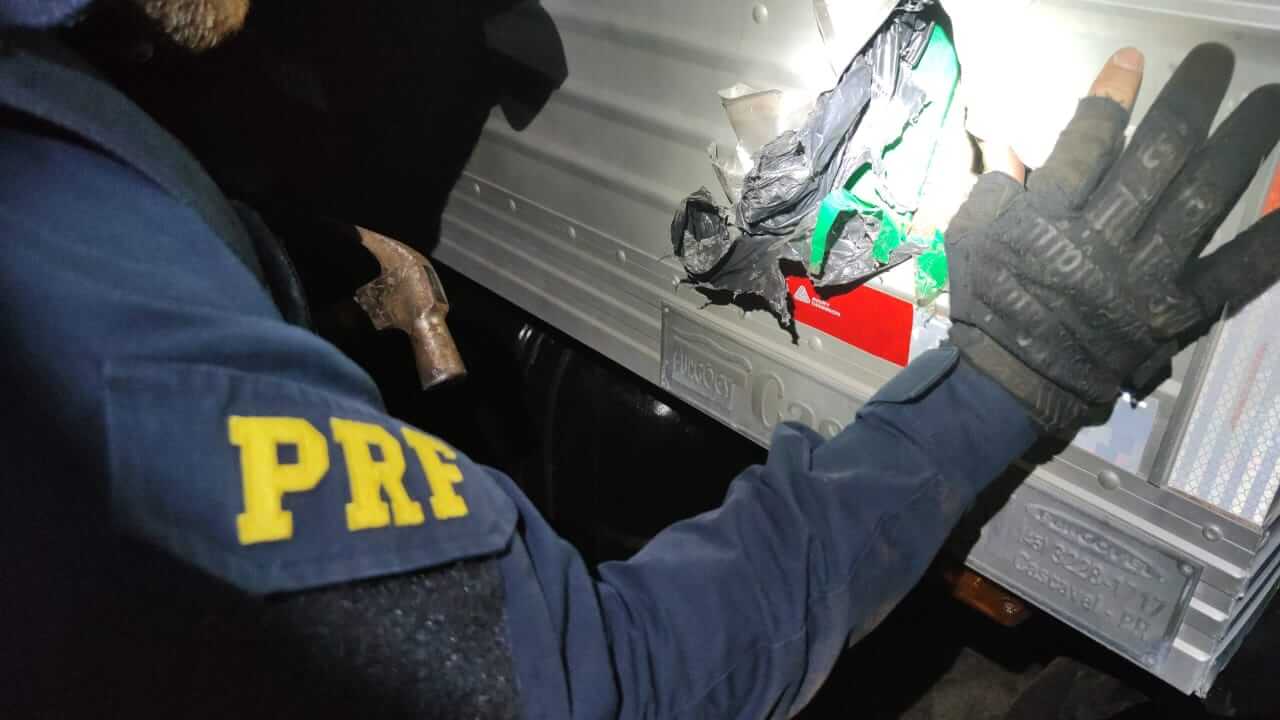 Durante abordagem a um M.Benz/1723 de Cascavel/PR, os policiais verificaram que o condutor estava com o exame toxicológico vencido. Além disso, notaram avarias e sinais de alterações na estrutura do baú do caminhão.