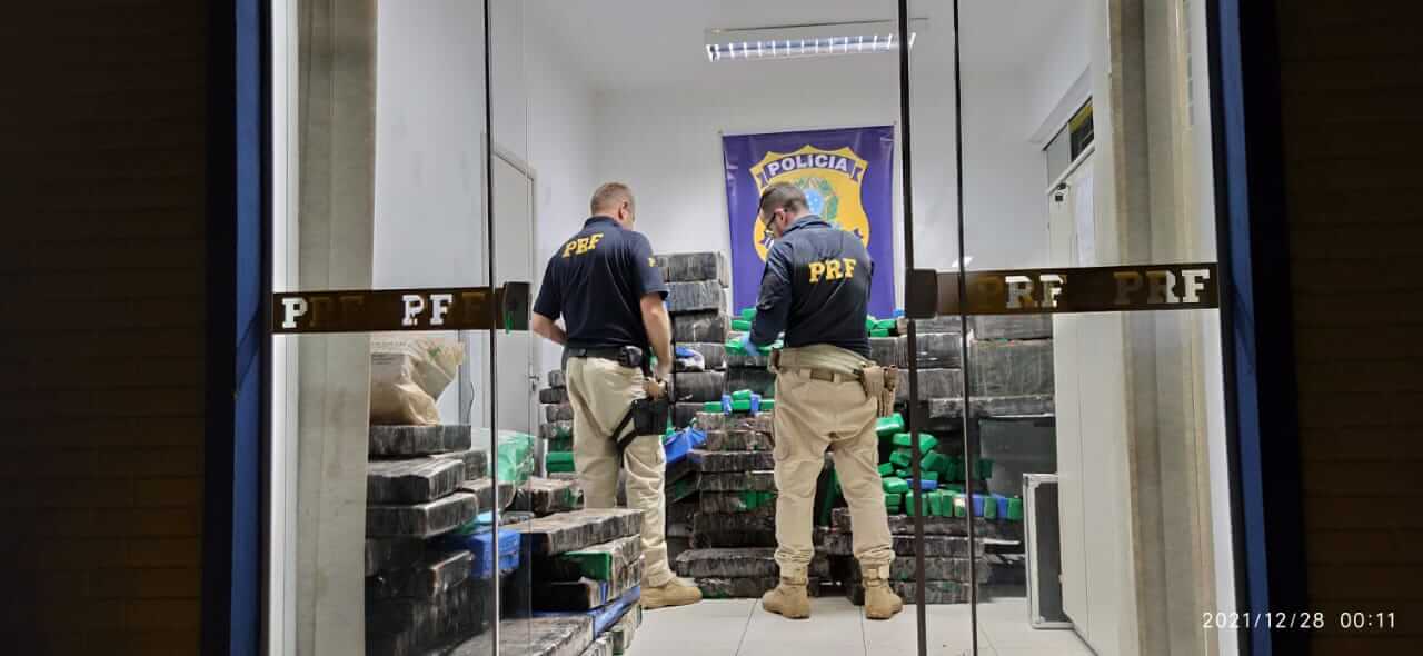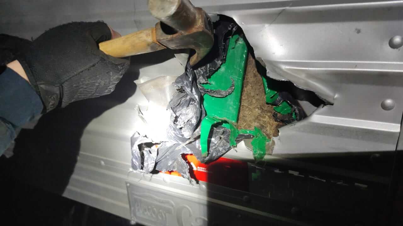 Após busca minuciosa, foi encontrado um fundo falso com aproximadamente um metro de largura, onde estavam escondidos diversos tabletes de maconha. Os PRFs pediram apoio do Corpo de Bombeiros para cortar a estrutura do baú e acessar todos os mais de 2 mil kg da droga.