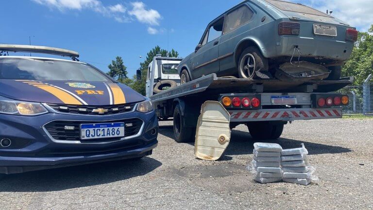 Durante fiscalização de rotina na Unidade Operacional de Barra Velha, no Litoral Norte de Santa Catarina, a Polícia Rodoviária Federal (PRF) abordou um caminhão guincho de Pinhais (PR), utilizado para transporte de veículos avariados. Sobre ele, os policiais encontraram quase R$ 150 mil em crack, em um automóvel Fiat/ 147, ano 1985, com placa de Foz do Iguaçu (PR), que estava em péssimo estado de conservação.
