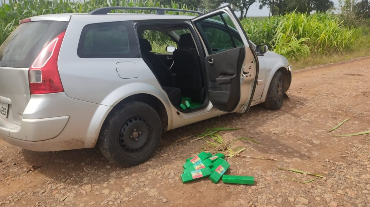 Após ordem de parada, o carro tentou escapar em alta velocidade na BR 163, sendo acompanhado de perto por viatura da PRF. Quilômetros à frente, o veículo foi abandonado em uma estrada de terra, e os dois ocupantes fugiram para um milharal.