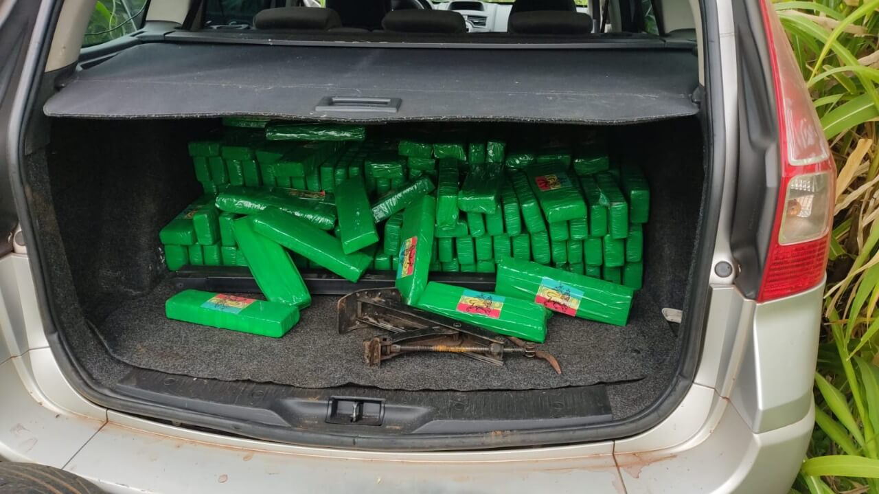 Nos bancos traseiros do carro e no porta-malas foram encontrados mais de cem tabletes de maconha, totalizando 167 quilos.