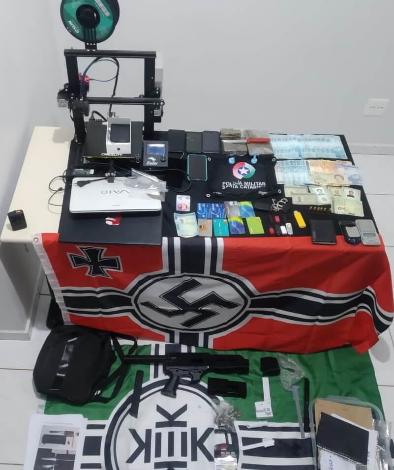 Na residência de um deles foi localizado diversos materiais tais como: balança de precisão, maconha, uma mochila contendo partes de uma arma feito em impressora em 3D (Simulacro), impressora 3D, manual de criação de armas em impressoras 3D, estojos de calibre 9mm, um carregador parcialmente desmontado, uma bandeira símbolo do Nazismo e outra do "Kekistan" (usada em fóruns de jogos), dois notebook, pen drives, diversos cartões de bancos além de cadernos contendo diversas anotações e uma apostila de curso de Russo e sementes de maconha.