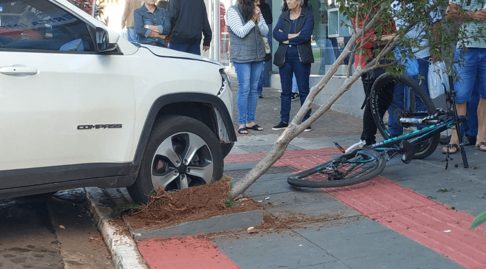 No local foi identificado o condutor do veículo JEEP/COMPASS o qual relatou que estava transitando pela Rua Santos Dumont sentido norte/sul, quando foi estacionar em vaga oblíqua, ao acionar o freio, pisou involuntariamente no acelerador.