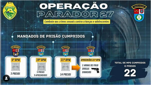 A Polícia Militar do Paraná, por meio do 5º Comando Regional, desencadeou no último sábado (14) a segunda fase da “Operação Parador 27”, voltada à prevenção e repressão do abuso e da exploração sexual de crianças e adolescentes.