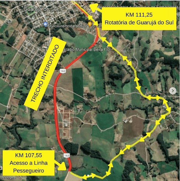 - Sentido norte - acesso ao desvio no km 109, seguindo em um trecho de 5 quilômetros pela Linha Pessegueiro até a rotatória de acesso à Guarujá do Sul, onde o motorista retorna à BR-163/SC.