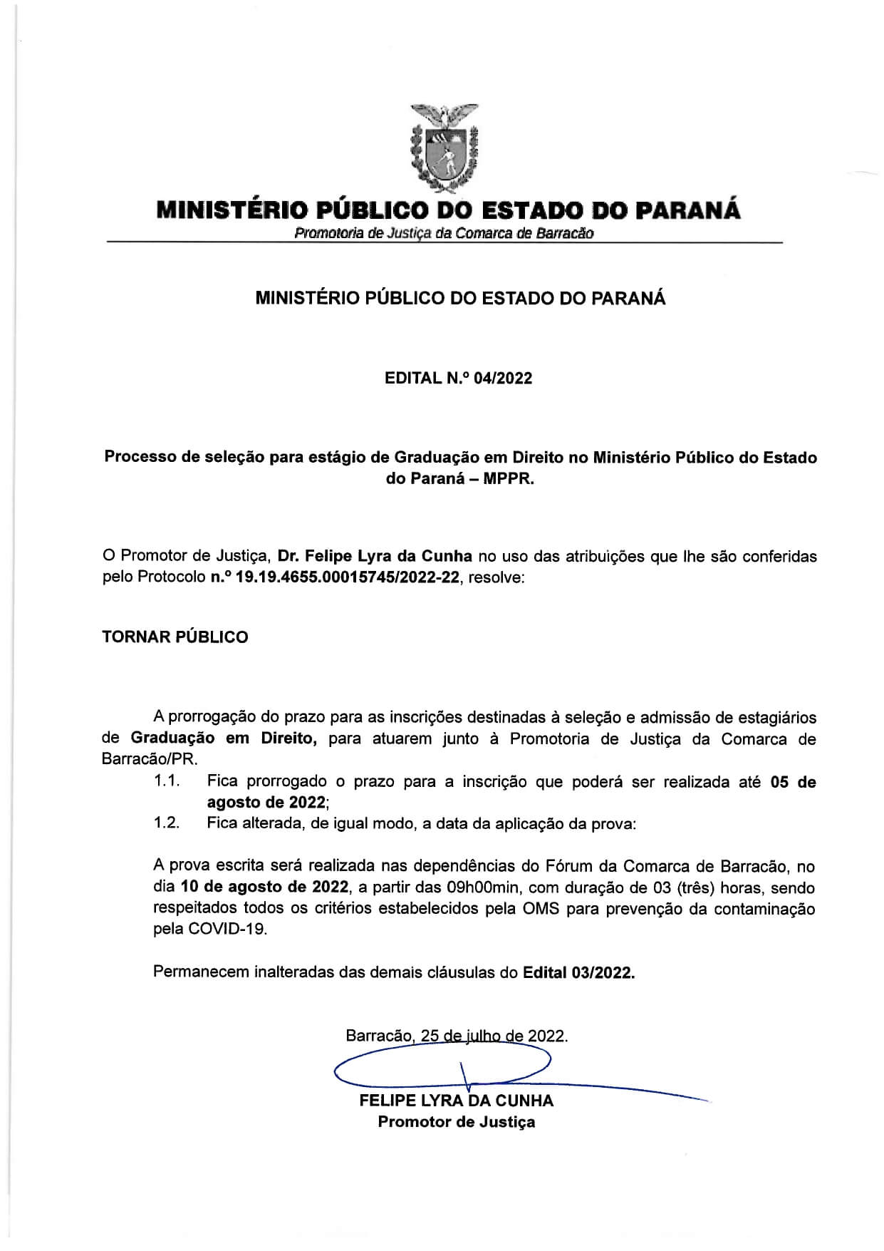Ministério Público de Barracão prorroga prazo de inscrições para estágio