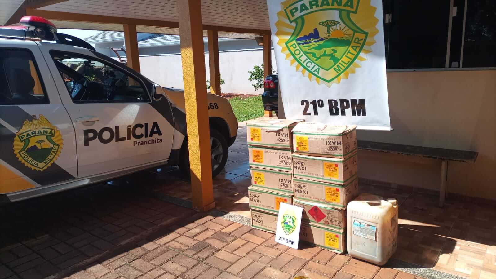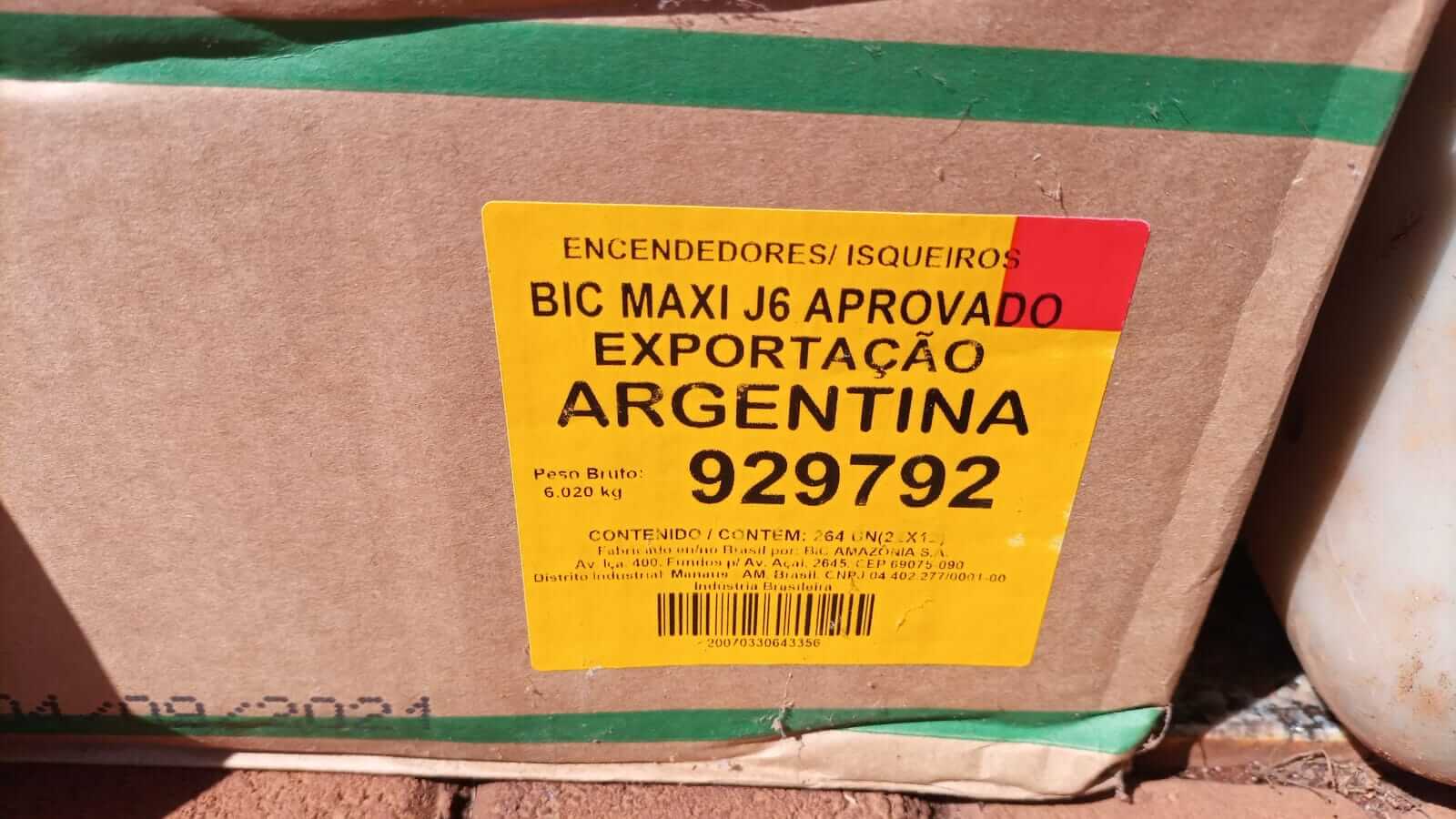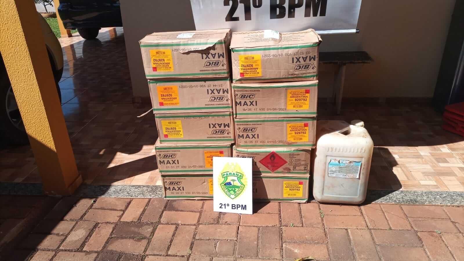Em buscas os policiais localizaram 10 caixas de isqueiros e em cada caixa continha 264 unidades, ainda, foi localizado um galão contendo combustível, produtos da Argentina.