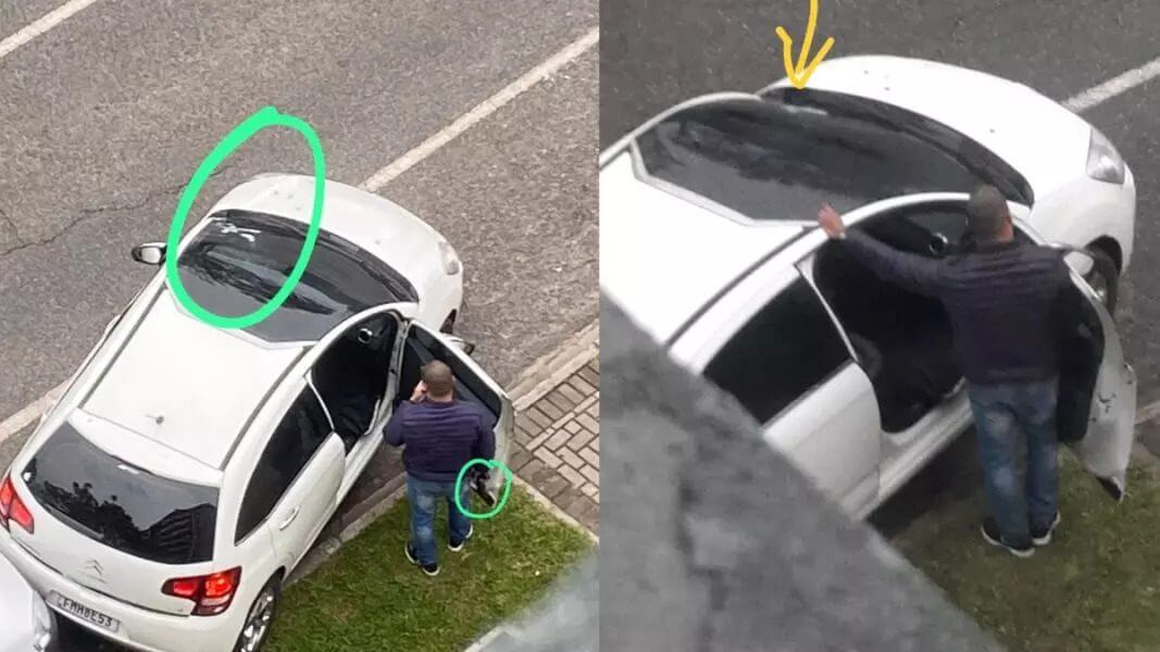 Na sequência, o homem atira várias vezes. O vídeo mostra ainda a motorista do carro dando marcha à ré para tentar fugir.