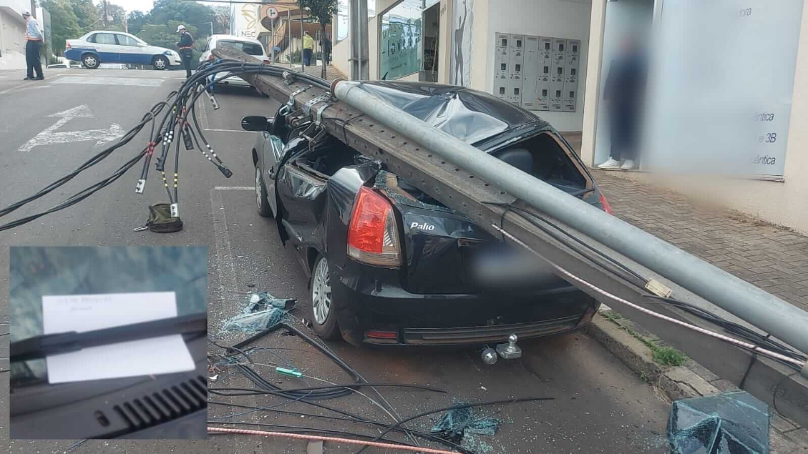 Motorista deixa bilhete para proprietária após caminhão derrubar poste e destruir carro estacionado