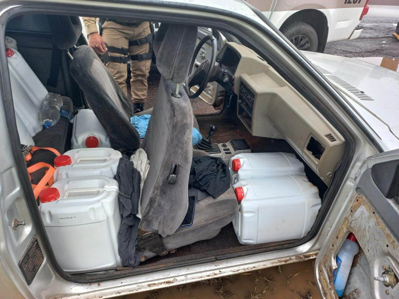 A primeira apreensão ocorreu na segunda-feira, dia 12, quando os militares abordaram, um VW Gol com placas de São Miguel do Oeste, carregado com 13 galões de agrotóxicos de 20 litros cada, sem marca aparente, que era transportado por um homem de 25 anos.