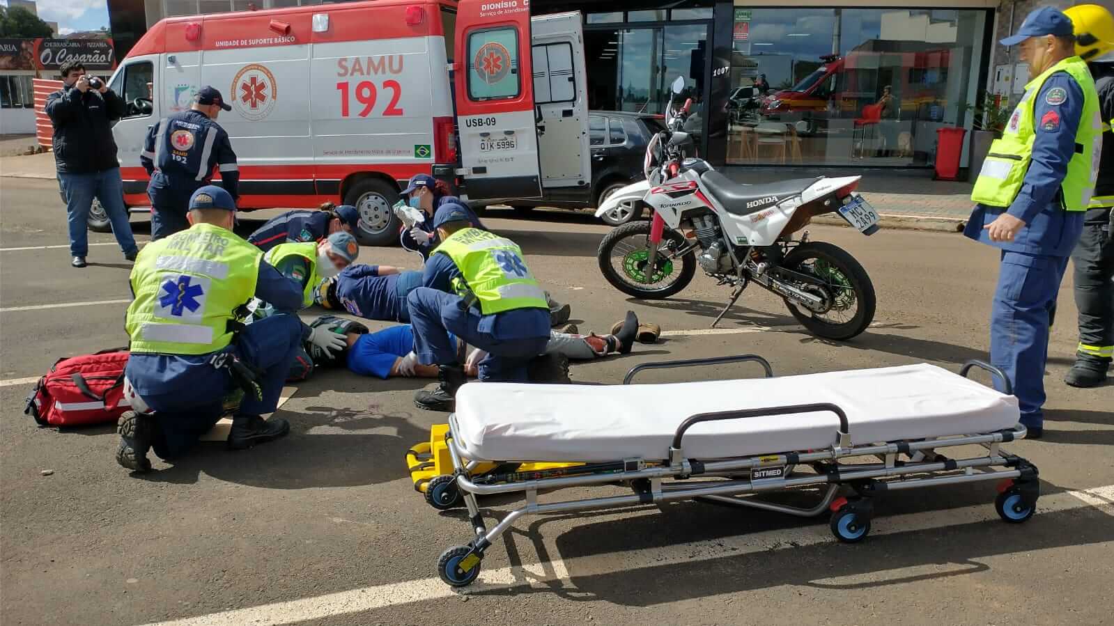 No local, os socorristas simularam o salvamento de dois jovens vítimas de acidente com motocicleta, realizando os procedimentos padrão de imobilização, e condução para atendimento médico.