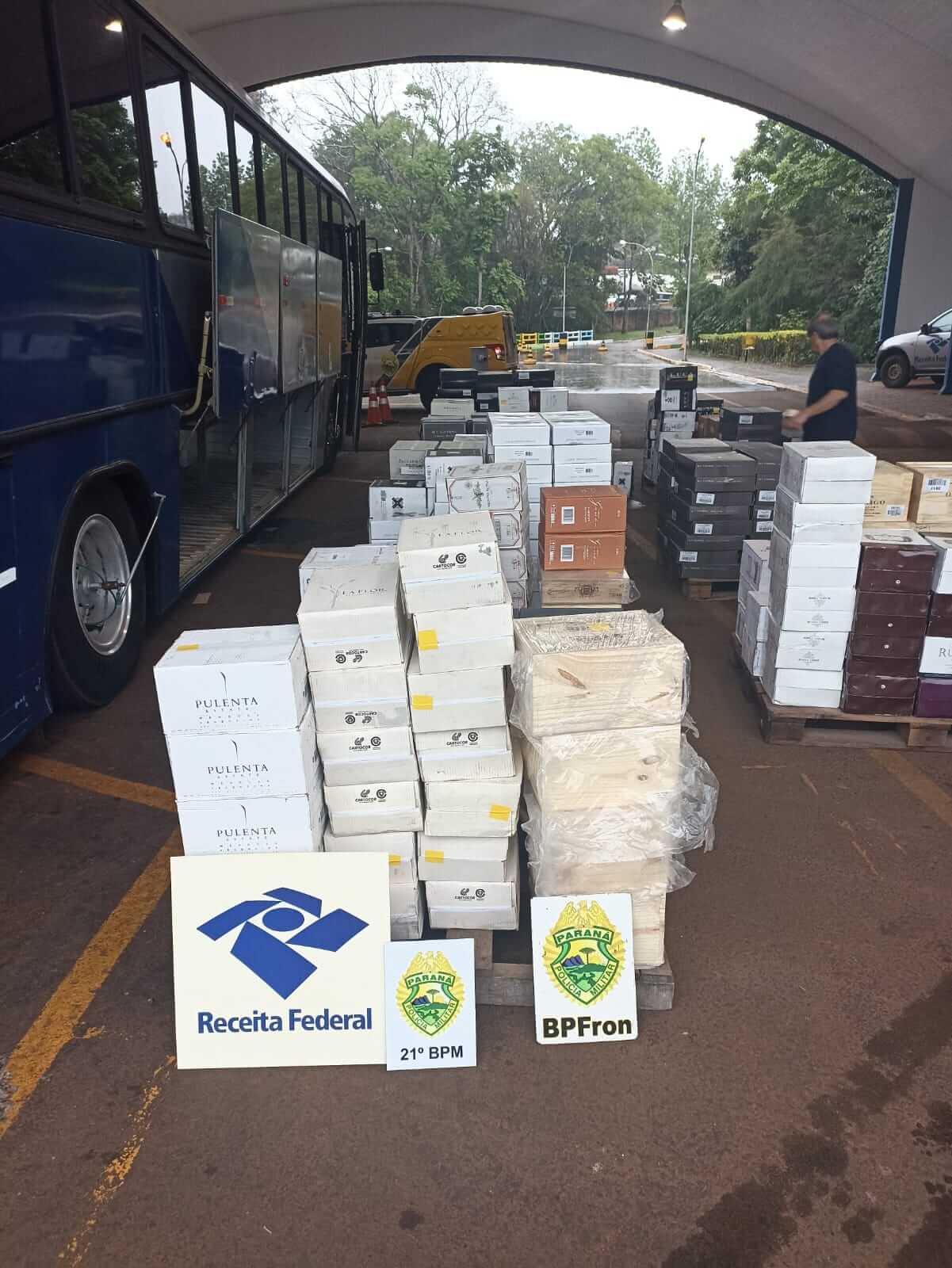 Diante dos fatos os veículos foram apreendidos e devido às más condições do tempo foi solicitado apoio a Receita Federal, sendo autorizado o uso da área coberta da Aduana para a conferência da carga, sendo contabilizados 2.978 garrafas de vinhos de origem estrangeira sem os devidos desembaraços aduaneiros.