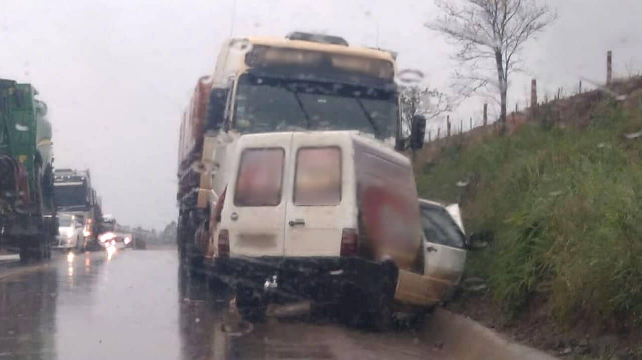 No local houve um acidente do tipo colisão frontal envolvendo uma Fiat Fiorino, emplacada em São José do Cedro/SC, e uma carreta de Santa Helena/PR.