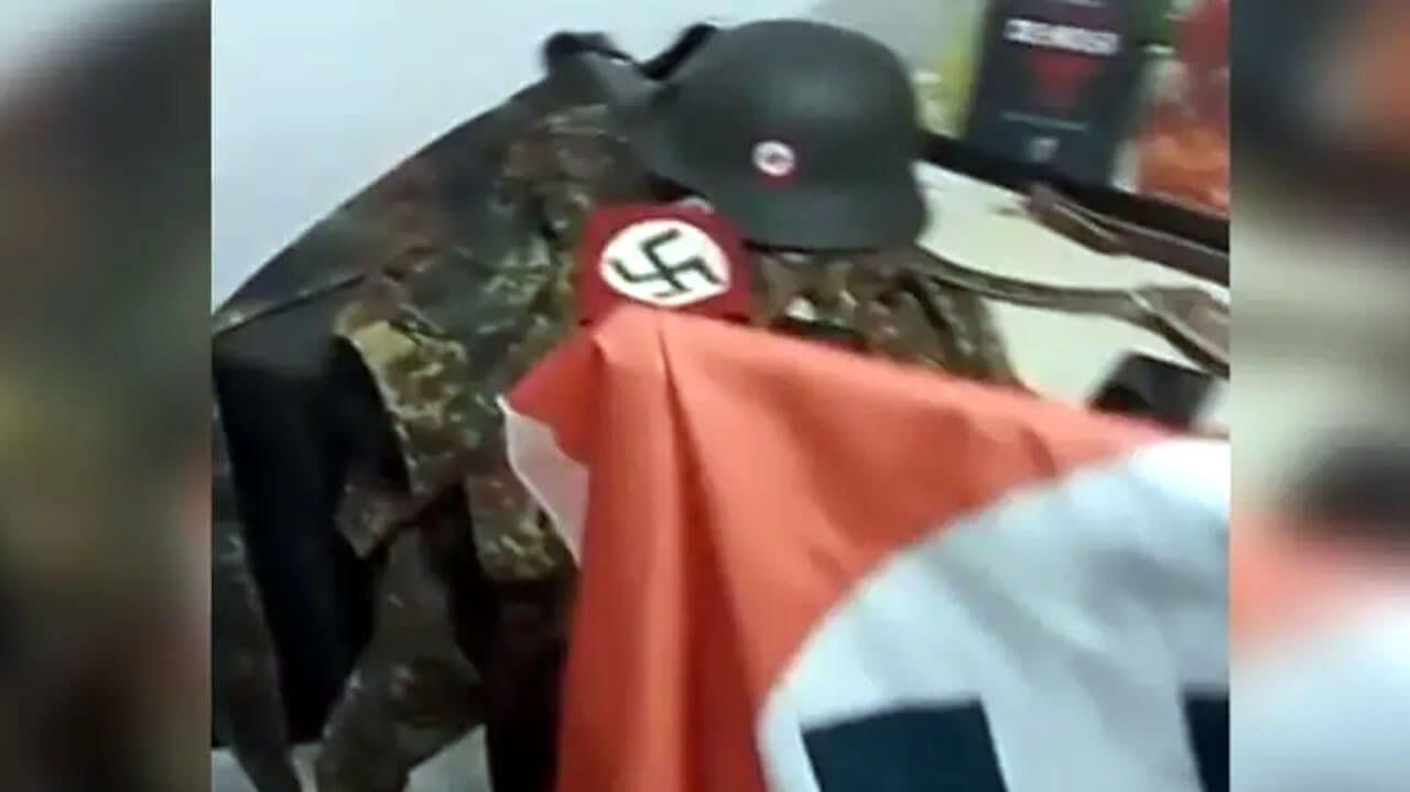 Em um dos vídeos, os membros investigados aparecem quebrando uma televisão. No centro da tela está colada uma caricatura usada para depreciar judeus.