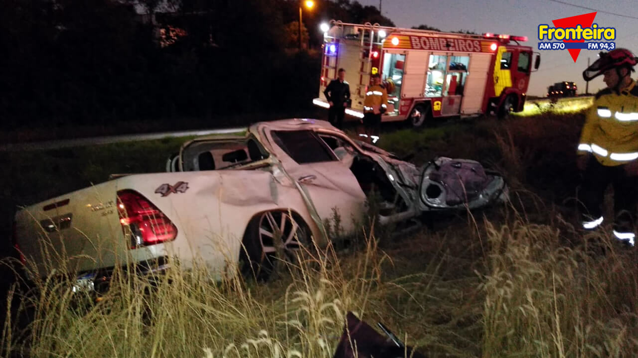 No local houve um acidente do tipo saída de pista seguido de capotamento, envolvendo uma caminhonete Toyota Hilux, ocupada por dois jovens.