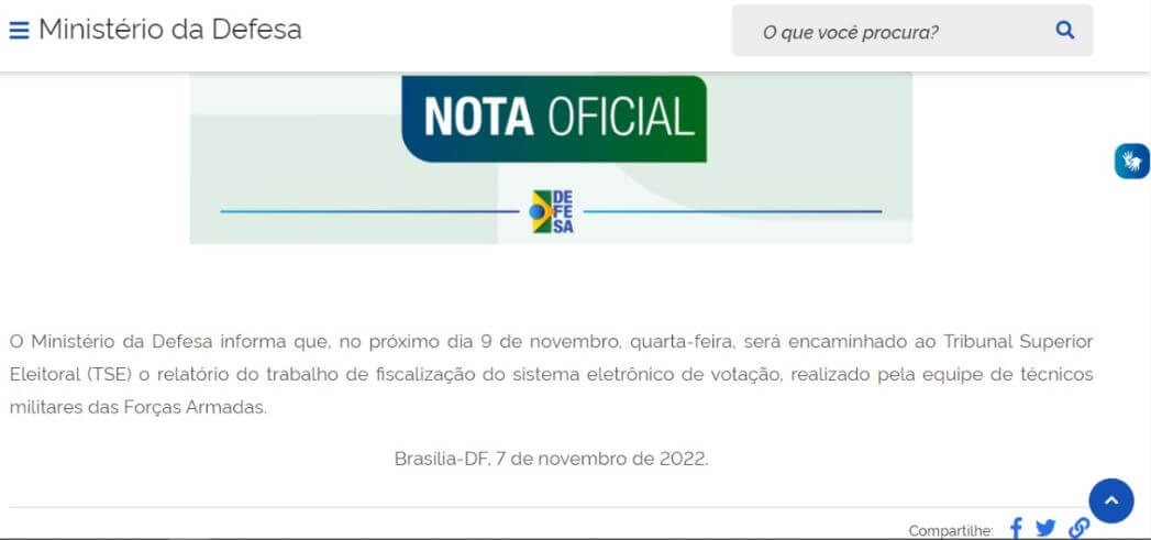 À época, contudo, a pasta disse que não cabe às entidades fiscalizadoras a realização de auditoria e respondeu que a equipe técnica das Forças Armadas atuou "estritamente dentro da legalidade". Segundo a Defesa, os militares não fizeram auditoria das urnas e limitaram-se à fiscalização do sistema eletrônico de votação.