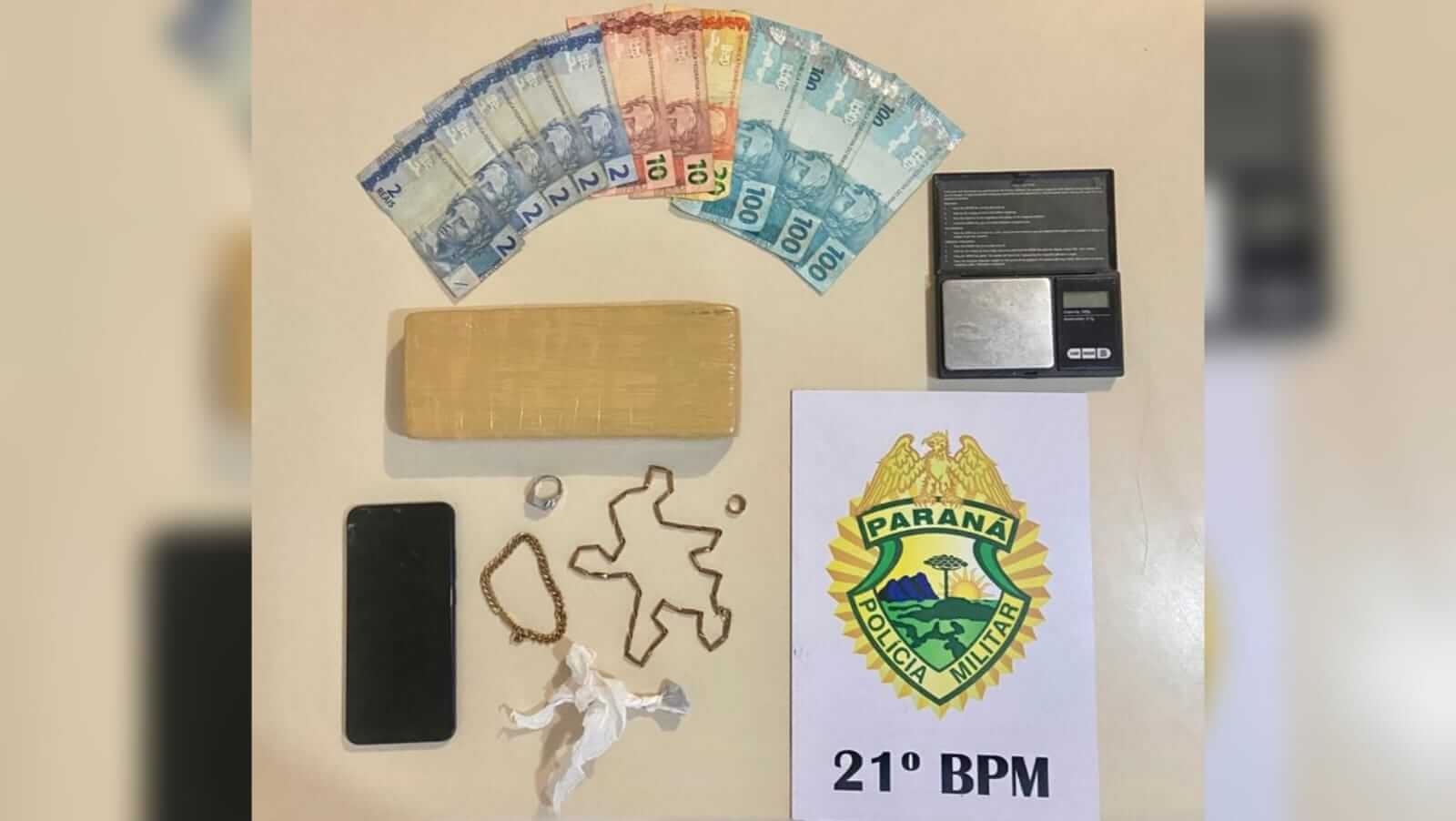Diante da situação de flagrância, a equipe entrou na residência dando voz de prisão aos moradores, sendo que em busca pessoal a equipe policial localizou no bolso de um dos detidos um celular e R$ 350,00 em várias notas.