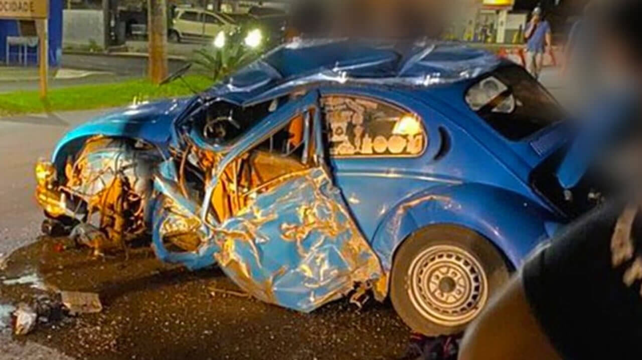 Segundo as informações no local o condutor de um VW Fusca perdeu o controle do veículo e colidiu violentamente contra um poste.