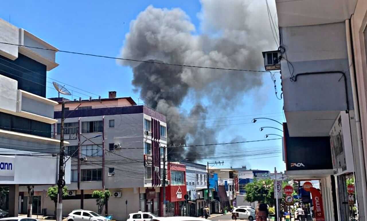 Um incêndio de grandes proporções que teve início por volta das 12h15, desta quinta-feira, 24, mobiliza o Corpo de Bombeiros no centro de São Miguel do Oeste.