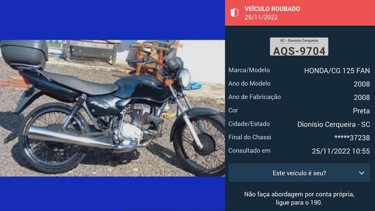 Qualquer informação sobre a motocicleta deve ser repassada a polícia mais próxima, ou pelo telefone 190.