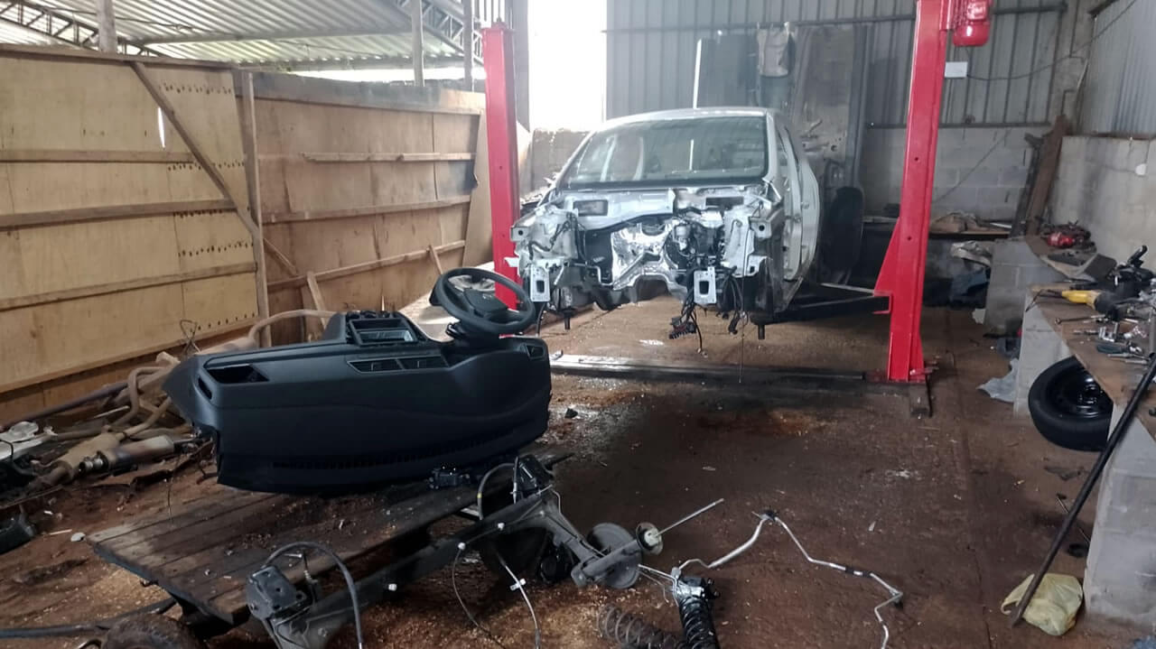 No galpão foram localizadas partes de um monobloco de um veículo cinza que seria de um GM Corsa, e um veículo vermelho também desmontado, que seria de um veículo Ford Fiesta.