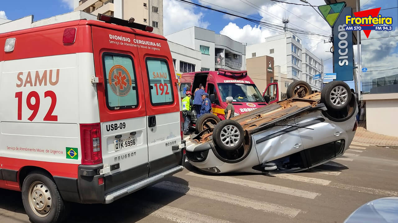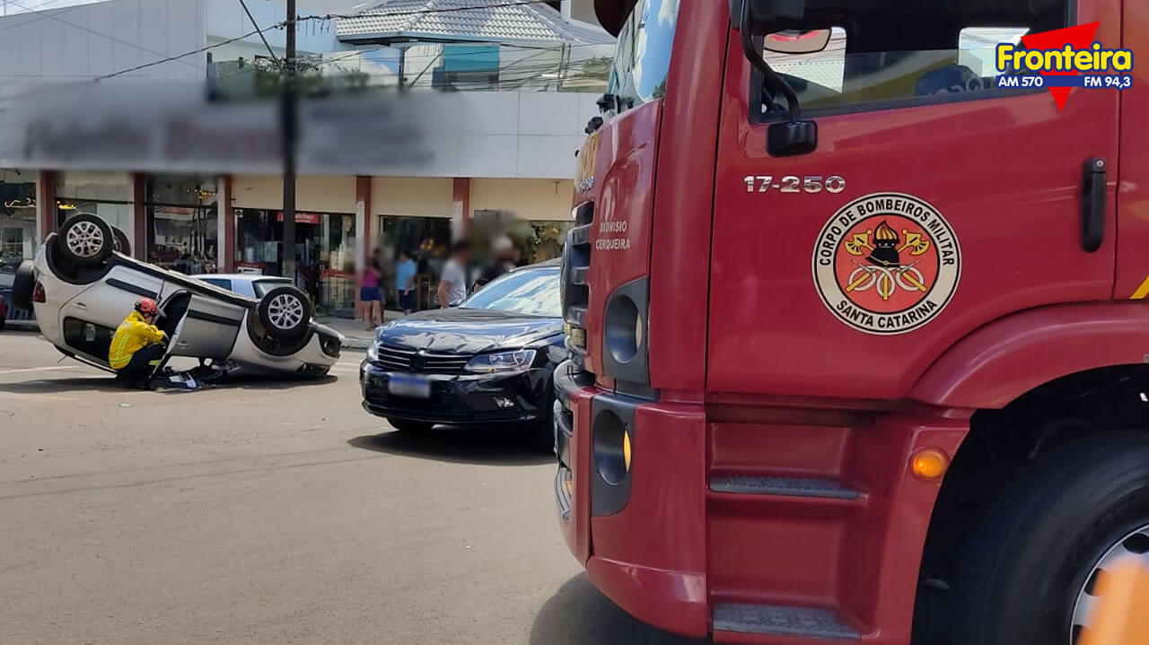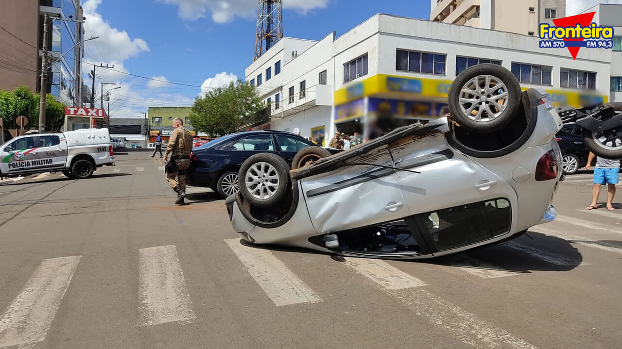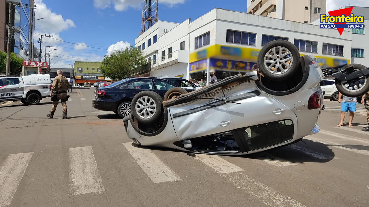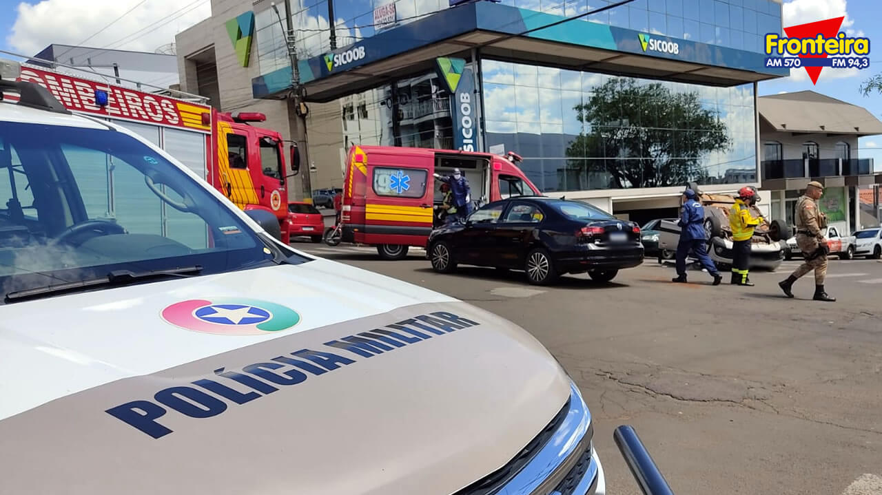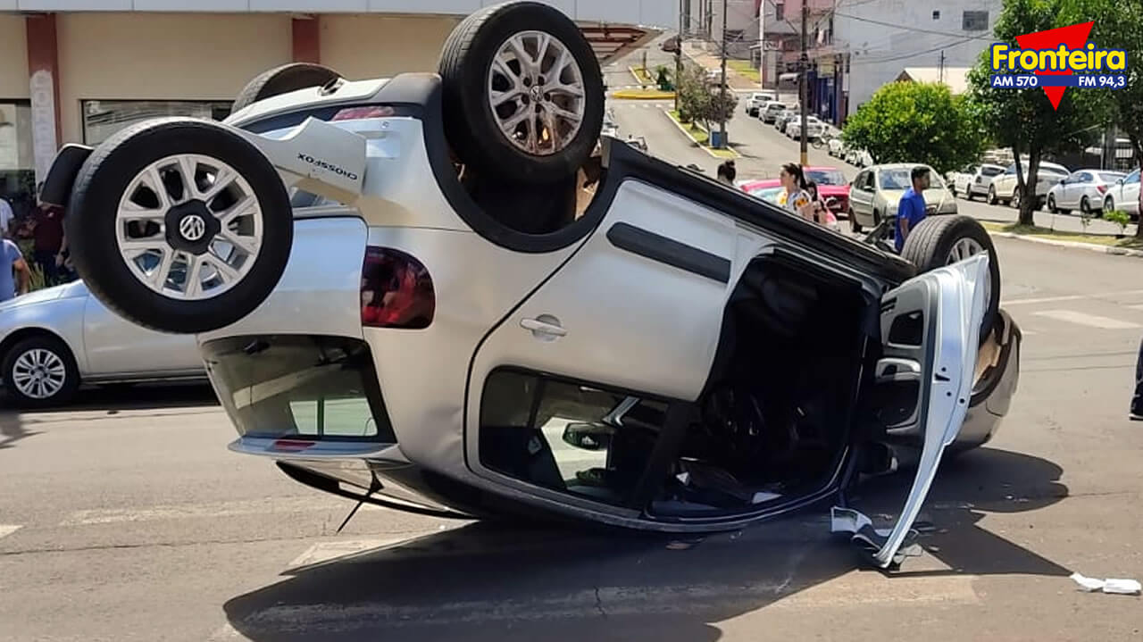 A colisão seguida de tombamento ocorreu por volta das 14h, no cruzamento da Av. Sete de Setembro com a Rua XV de Novembro.