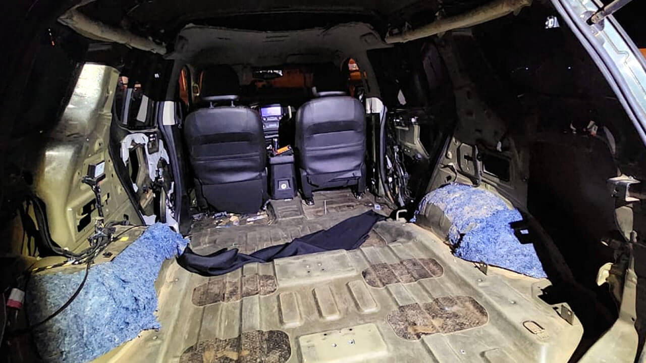 Diante dos fatos a caminhonete foi encaminhada para a sede do 3º pelotão, onde foi realizada uma busca minuciosa e constatado que estaria sem o banco traseiro, forros de porta e equipada com rádio comunicador, restos de carteiras de cigarro e pano preto, características típicas de veículo utilizado para ilícitos como contrabando e descaminho.