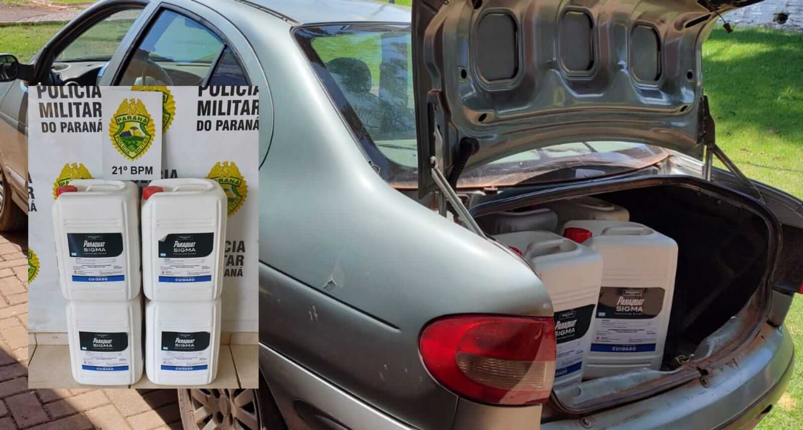 No local os policiais avistaram um veículo Renault Megane e um carrinho de mão. Procedida a vistoria ao veículo que estava aberto e com a chave na ignição, foi constatado que estava carregado com quatro galões de agrotóxico Paraquat Sigma de 20 litros cada.