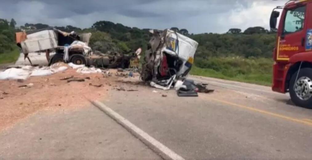 Imagens captadas por uma câmera de monitoramento mostram o momento da batida de frente dos dois caminhões no km 160 da rodovia federal. Um dos motoristas morreu na hora. O outro foi socorrido, mas foi a óbito no hospital.